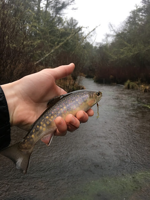 After the rainbow I caught a few more brookies, then moved on to another stream. I knew the tide would be rising when I arrived, so I decided to check out the mouth of the stream at the bay. I've never caught a fish there, but I know the fish are there at least some of the time, so I decided it was worth a shot. I didn't catch anything this time either, so I moved upstream to more familiar waters. The tide was high, but I managed to get one nice fish out of the murky waters. After that I called it a day, leaving in time to beat rush hour traffic home.